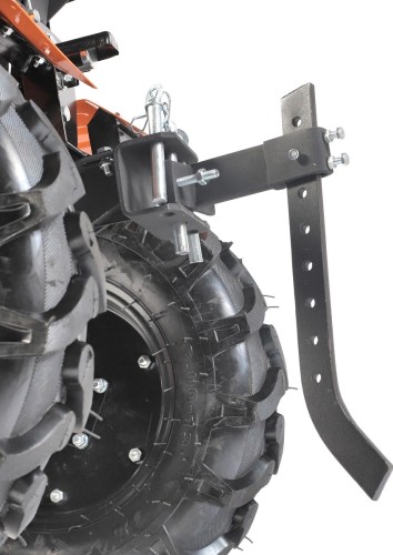 Пневматические колеса с рельефным протектором из высококачественной резины обеспечивают надежное сцепление с грунтом. Упор добавляет устойчивости при работе.