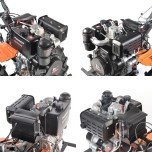 Мотоблок совместим с различной навеской благодаря универсальному прицепному узлу и валу отбора мощности (ВОМ), что расширяет его функционал. Доступны два вида старта: ручной и электро, с аккумулятором 12В для легкого запуска.