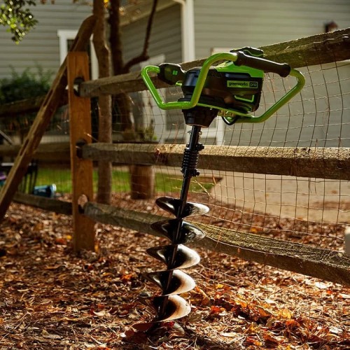 Мотобур аккумуляторный Greenworks 82V GC-AUGER (арт. 3707907) из линейки Greenworks 82V Commercial поставляется без АКБ и ЗУ. Мотобур – устройство со множеством применений! Строители используют его для бурения ям под сваи, столбы, подготовки фундамента. Рытье траншеи существенно облегчится, если сначала пробурить отверстия в грунте близко друг к другу, а потом просто их соединить. Садоводом мотобур пригодится при посадке деревьев и кустарников. Любители зимней рыбалки оценят достоинства применения мотобура для сверления лунок (шнек для льда в комплект не входит). Для мотобура подходят самые распространенные на рынке шнеки с посадочным диаметром 20 мм. Надежный бесщеточный двигатель сопоставим по мощности с бензиновыми аналогами. При этом такой электродвигатель абсолютно экологичен, имеет высокий крутящий момент (работает быстрее бензинового аналога), имеет низкий уровень шума и вибраций, а так же прост в эксплуатации потому, что не требует подготовки масло-бензиновой смеси и какого-либо обслуживания. Мотобур отличается высокой производительностью и способен пробурить до 35 отверстий диаметром 200 мм на одном заряде АКБ емкостью 5Ач.