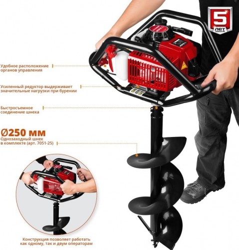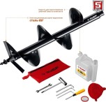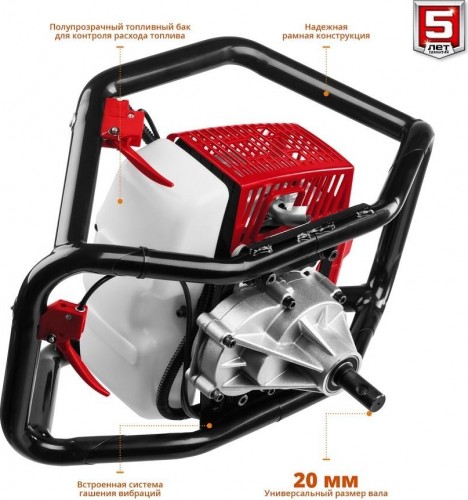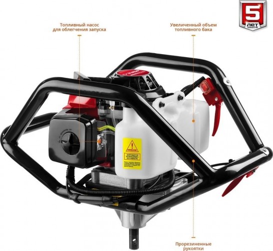 Мощный инструмент для бурения отверстий в мягких, твердых, мерзлых грунтах, а также во льду. Мощный 2-х тактный двигатель и универсальная конструкция рамы позволяют быстро и эффективно произвести необходимые работы по бурению. Конструкция рамы мотобура позволяет работать как одному, так и двум операторам, что повышает эффективность бурения, кроме того обеспечивает дополнительную сохранность двигателя при работе и транспортировке.