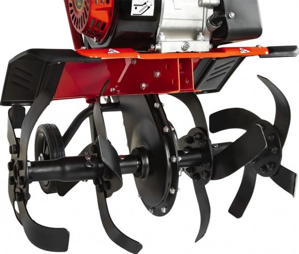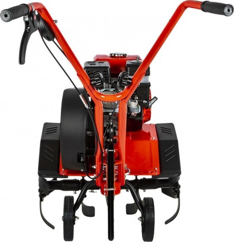 Мотокультиватор предназначен для обработки почвы на садовых участках. Съемные рукоятки упрощают хранение инструмента. Система воздушного охлаждения предотвращает перегрев двигателя, увеличивая срок его службы. Опорные колеса упрощают транспортировку.