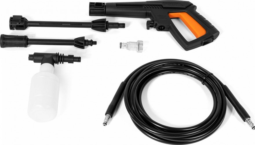 Мойка высокого давления с алюминиевой помпой снабжена грязевой фрезой и встроенным генератором пены. Для защиты электродвигателя от перегрева устройство оснащено датчиком воды, который автоматически отключает питание помпы при перебоях в водоснабжении.