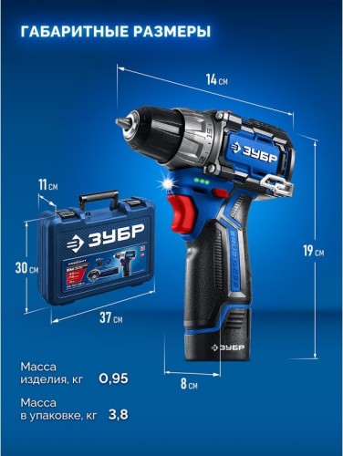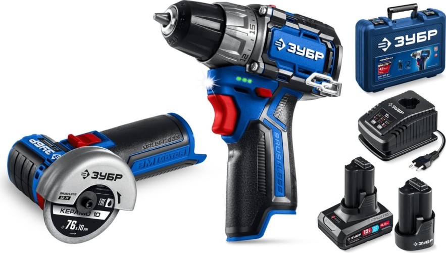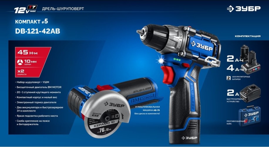 Набор аккумуляторного инструмента ЗУБР DB-121-42AB КОМПАКТ #5 (дрель-шуруповерт + УШМ + LED фонарь)