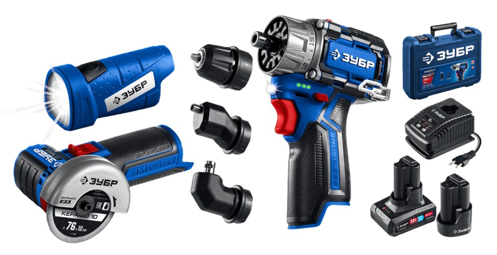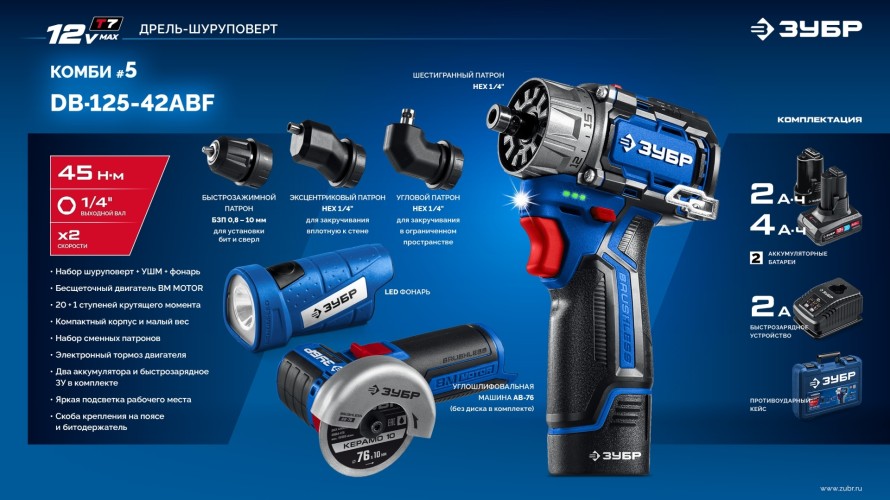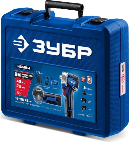 Набор аккумуляторного инструмента ЗУБР DB-125-42ABF КОМБИ #5 (дрель-шуруповерт + УШМ + LED фонарь)