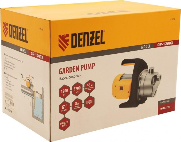 Садовый поверхностный насос Denzel GP1200X используется для забора чистой воды из колодцев, емкостей и водоемов, а также для организации системы полива и водоснабжения на даче. Способен подавать воду на высоту до 46 м, поэтому его можно подключать к водопроводной системе для обеспечения стабильного напора.