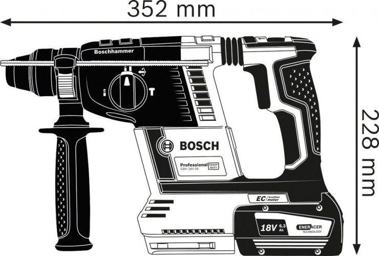 GBH 18V-26 Bosch Professional - это универсальный аккумуляторный перфоратор Bosch SDS plus с бесщеточным двигателем, который идеально подходит для повседневного использования. Перфоратор оснащен системой KickBack Control и Electronic Precision Control для повышенной защиты пользователя. Его мощный бесщеточный двигатель обеспечивает энергию удара 2,6 Дж. Этот перфоратор подходит для сверления и долбления бетона, кирпичной кладки, дерева и металла. GBH 18V-26 также имеет различные дополнительные функции, такие как постоянная скорость, светодиодная подсветка, предохранительная муфта, регулировка скорости и контроль вибрации. Перфоратор совместим с системой пылеудаления GDE 18V-16 Professional для удобства пылеудаления во время работы. GBH 18V-26 входит в аккумуляторную семью 18В Bosch Professional и совместим со всеми аккумуляторами из данной линейки. Ширина 483 мм Высота 132 мм Глубина 363 мм Вес 6.80 кг