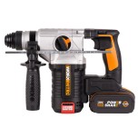 Бесщеточный двигатель. Перфоратор WX380 оснащен бесщеточным двигателем нового поколения, Благодаря отсутствию щеток, аккумуляторный перфоратор получил на 25% больше мощности и увеличенный на 50% срок службы по сравнению с щёточными аналогами. 3 функции перфоратора. Универсальный перфоратор WORX WX380 совместил в себе сразу 3 режима работы: сверление, ударное сверление и долбление, а также возможность установки долота в патроне под нужным углом. Благодаря скорости вращения до 1210 оборотов в минуту и ударной энергии 2,2Дж, перфоратор позволяет легко сносить стены и разбивать бетонные блоки. Кроме того, WX380 позволяет регулировать скорость и сторону вращения. Удобство работы. Перфоратор имеет эргономичную основную рукоять с резиновым покрытием и откидную боковую ручку с антивибрационной системой. Металлический ограничитель глубины сверления позволяет избежать погрешности в ходе работы. Для комфортного и безопасного сверления в условиях ограниченной видимости предусмотрена светодиодная подсветка. Безопасность работы обеспечивается предохранительной муфтой. SDS-Plus. Патрон SDS-Plus обеспечивает простоту подбора и замены оснастки. Быстрозажимной патрон позволяет быстро подготовить перфоратор к работе без использования дополнительного инструмента. Аккумуляторная конструкция. Работа от универсального аккумулятора WORX Powershare 20В избавляет вас от лишних неудобств. Аккумулятор обеспечивает длительную автономную работу, быстрый запуск перфоратора и отсутствие вредных выбросов в окружающую среду. Электронная плата защиты от глубокого разряда гарантирует длительный срок службы батареи. Технические характеристики : Напряжение: 20 В. Тип двигателя: бесщеточный. Скорость холостого хода: 0 - 1210 об / мин. Скорость удара: 0 - 5400 ударов в минуту. Энергия удара: 2,2 Дж. Диаметр сверления: бетон 24мм/ дерево 27 мм/Сталь 13 мм. Время зарядки аккумулятора : 2 часа. Вес : 2,6 кг.