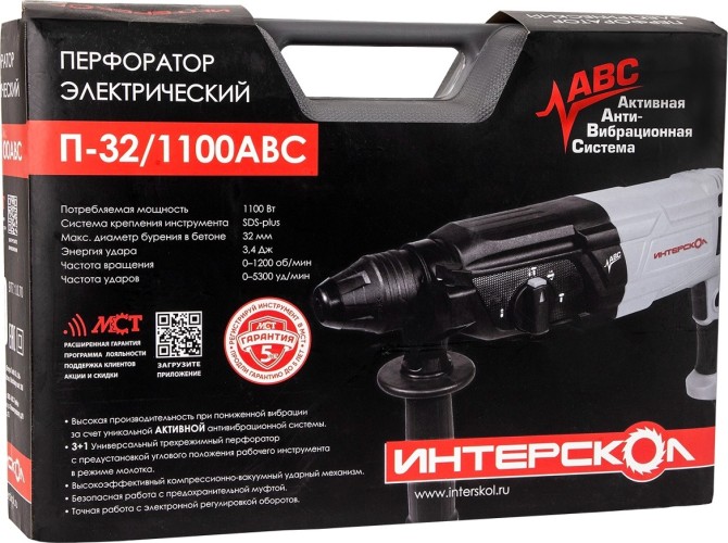 Перфоратор ИНТЕРСКОЛ П-32/1100АВС профессиональный трехрежимный с активной виброзащитой, основанной на встречном движении масс, предназначен для бурения бетона, натурального и искусственного камня, кирпича, сверления отверстий в древесине, стали и сплавах, композитных и прочих материалах, а также выполнения отбойных операций (пробивание штроб и борозд) за счет высокоэнергетического ударного воздействия на обрабатываемую поверхность. Рекомендуется для профессионального применения на промышленных предприятиях, объектах строительства и ремонта, в частных мастерских, подсобных хозяйствах и т.д.