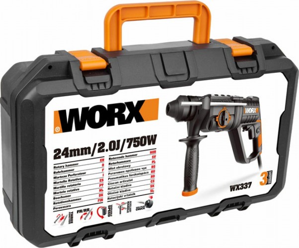 WORX WX337 – это мощный сетевой перфоратор с щеточным электродвигателем 750Вт и универсальным патроном SDS-PLUS 24мм. Мощный и надежный сетевой перфоратор отлично подходит для бытового и профессионального использования. Для удобства хранения и транспортировки, в комплект поставки включен пластиковый кейс.