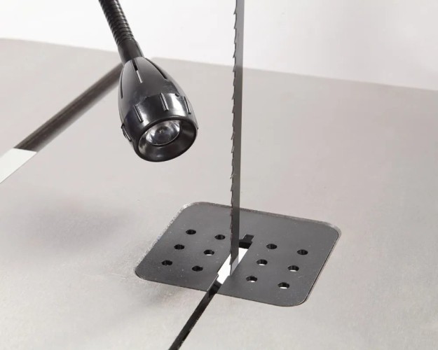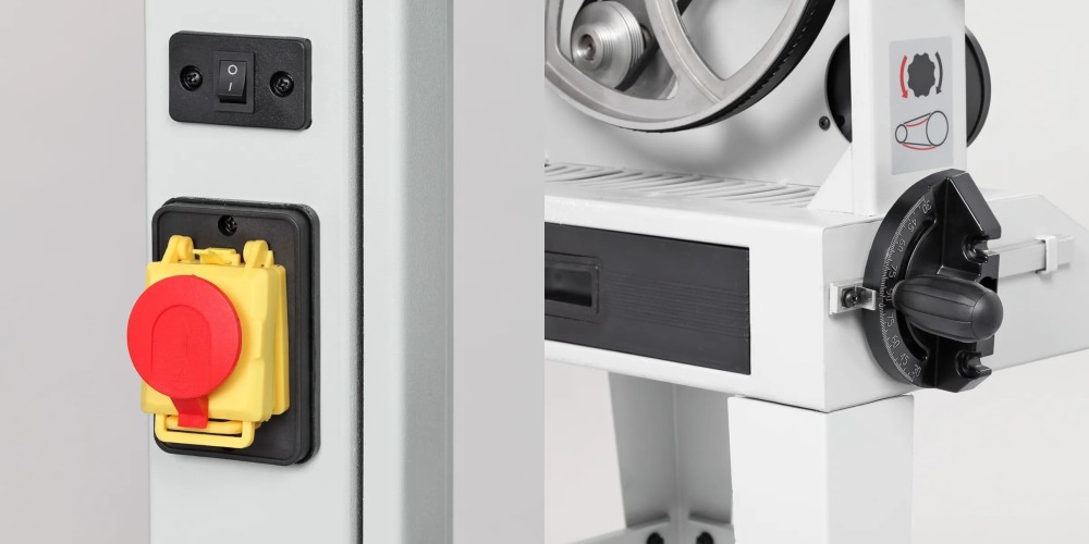 Модель оборудована устройством для резки кругов и толкателем. Для подсветки рабочей зоны предназначена светодиодной лампа на гибком держателе. Ее выключатель выведен на раму над выключателем станка.
