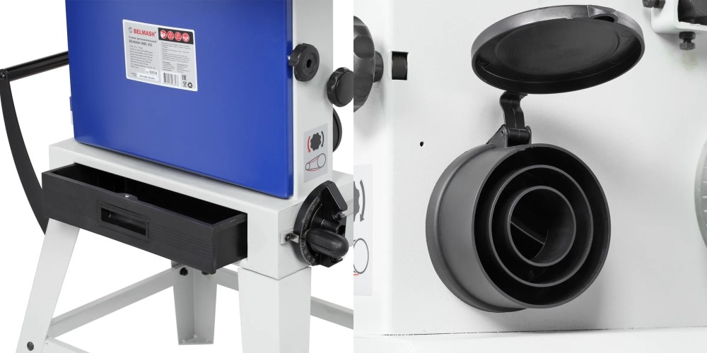 Станок можно устанавливать как на верстак, так и на подставку (входит в комплект). В нижней части рамы предусмотрен ящик для сбора отходов резания. На раме имеются крепления для размещения углового упора, толкателя и шестигранных ключей.
