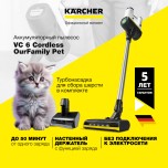 Аккумуляторный пылесос VC 6 Cordless ourFamily Pet гарантирует превосходные результаты уборки, удобен в обращении, не ограничивает свободу движений и способен непрерывно работать до 50 минут от одного заряда. Его мощный (250 Вт) бесщеточный двигатель постоянного тока позволяет легко и тщательно очищать любые поверхности, в т. ч. от кожных чешуек и шерсти домашних животных. При необходимости сила всасывания может быть увеличена путем включения режима Boost. Моторизованная насадка для пола со светодиодной подсветкой пригодна для очистки твердых и ковровых напольных покрытий, а для чистки матрасов и обивки мягкой мебели предусмотрена моторизованная мини-турбощетка. Удобство работы обеспечивается простотой опустошения контейнера для сбора мусора, 3-ступенчатым индикатором состояния заряда аккумулятора и эргономичной конструкцией аппарата, облегчающей очистку пола под мебелью. Значительным преимуществом является также низкий уровень шума, не пугающий животных. Выключатель аппарата снабжен фиксатором, исключающим необходимость постоянно удерживать его в нажатом состоянии. Компактный аппарат можно использовать и в качестве ручного пылесоса – например, для чистки мебели. В комплект поставки включены щелевая насадка, щеточная насадка для мебели «2 в 1», инструмент для очистки фильтра, второй сменный фильтр и настенный держатель с функцией заряда.