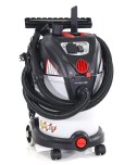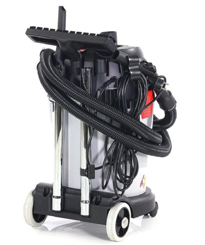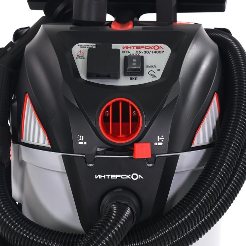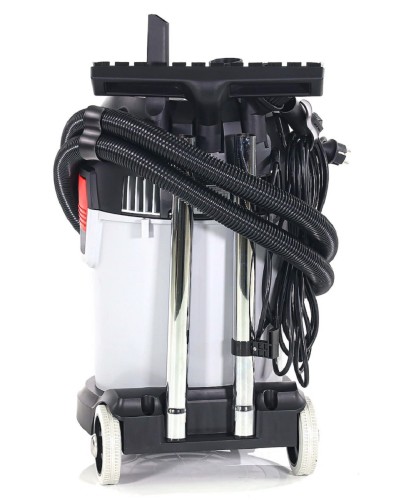 Корпус пылесоса выполнен из ударопрочного пластика. Пылесос оснащен системой циклон и надежным складчатым полиэстровым фильтром с площадью поверхности 3500 кв.см, максимально автоматизирован – оснащен розеткой для электроинструмента и автоматикой, которая активизирует пылесос в момент включения инструмента. Пылесос работает как с мешками, так и без мешков, собирая мусор в бак. Байпасная схема прохода воздуха позволяет производить как сухую, так и влажную уборку - убирать негорючие и неагрессивные жидкости и обеспечивает стабильное охлаждение двигателя. Пробка в нижней части бака дает возможность аккуратно слить собранную жидкость. Переключение в режим выдува позволяет убирать мусор с поверхностей без сбора его в бак.