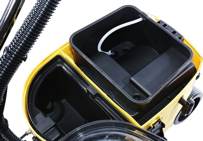 Аппрат распыляет рствор чистящего средства, глубоко проникающий в структуру текстильного покрытия, после чего собирает его вместе с отеделенной от волокон грязью. Модель оснащена отсеком для средства - удалителя запахов - если нет возможности сразу слить грязную воду.