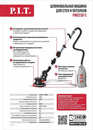 Шлифмашина PWG230-C – производительный и мощный инструмент для стройки или ремонта помещений. Используется для шлифования цементных покрытий, шпаклевки, подготовки стен и потолков к покраске, шлифования шпаклеванных и оштукатуренных стен.