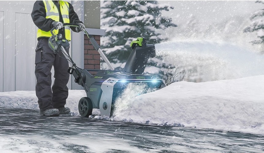 Снегоуборщик аккумуляторный GREENWORKS GD82STK5 — предназначен для очистки от снега территории перед домом, гаражом, а также веранд, дорожек и других мест, где затруднительно использовать бензиновый снегоочиститель или есть декоративные покрытия.