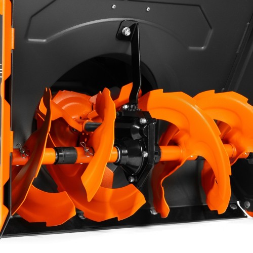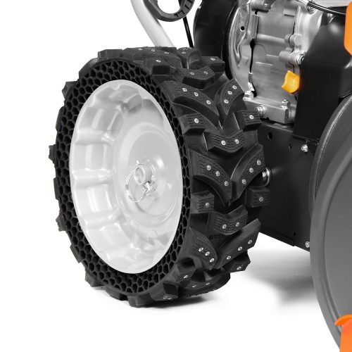 Агрессивные стальные шнеки-ледорубы эффективно захватывают и измельчают не только свежевыпавший, но и слежавшийся, обледенелый снег. Особое внимание уделено колесной базе: уникальные безвоздушные колеса EX-ICE с глубоким рисунком протектора обеспечивают отличное сцепление и проходимость даже на укатанном или скользком покрытии.