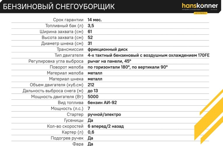 Hanskonner HSTG7661ELT - мощный и производительный самоходный бензиновый снегоуборщик с максимальным уровнем оснащения. Предназначен для расчистки территорий средней и большой площади от снега различной плотности, как свежевыпавшего, так и слежавшегося.