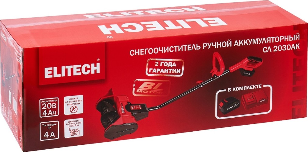 Аккумуляторный снегоочиститель ELITECH СЛ 2030АК с напряжением питания 20 В, шириной обработки 305 мм и высотой 127 мм предназначен для уборки снега с ровных и твердых поверхностей, с соблюдением правил технической безопасности.