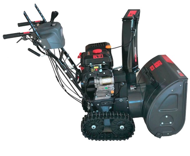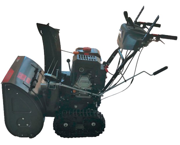 Гусеничный бензиновый снегоуборщик EVOline SBG 700 TLE с шириной захвата 70 см. Установлена система разблокировании дифференциала, и снегоуборщик EVOline SBG 700 TE разворачивается на месте нажатием курка на ручке. Для уборки снега в холодную погоду можно включить функцию подогрева рукояток. Гусеничное шасси обеспечиваем максимальный контакт со снегом, что практически исключает пробуксовку гусениц даже в сложных погодных условиях. Все управление производится джойстиками с панели управления. В качестве силового агрегата установлен зимний четырехтактный бензиновый двигатель Loncin мощностью 13 л/с.