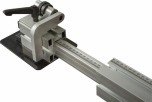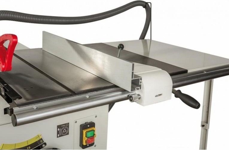 Рабочий стол выполнен из чугунного литья, его можно расширить одной или двумя секциями. Первым ставится чугунный расширитель, к нему можно пристыковывать сегмент из стального листа, оборудованный опорой. Такая база позволяет распиливать детали с отступом 1220 мм от параллельного упора. Сам упор выполнен по классической для профессиональных станков схеме: крепится к массивному чугунному основанию, которое перемещается по цилиндрической направляющей и фиксируется эксцентриковым стопором.