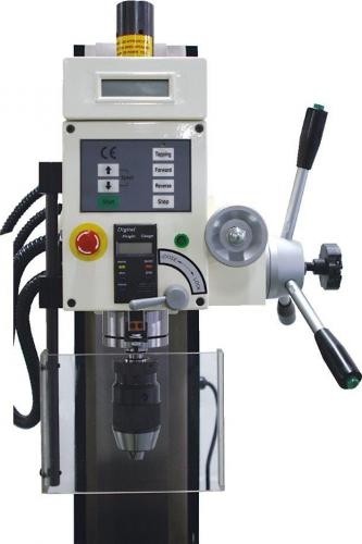 Моторная группа станка JMD-3T DRO представлена безколлекторным двигателем мощностью 1,0 кВт. Управление работой двигателя осуществляется с пульта, расположенного голове станка. Двигатель имеет плавную регулировку частоты вращения. Диапазон частоты вращения составляет 100-1750 об/мин. Переключение двигателя в режим реверса осуществляется кнопкой, расположенной на рукоятке пиноли.