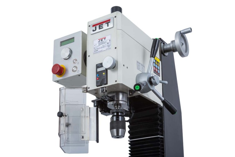 Моторная группа станка JMD-X2L представлена бесколлекторным двигателем мощностью 750Вт. Управление работой двигателя осуществляется с панели управления, расположенного с левой стороны сверлильной головки. Двигатель имеет плавную регулировку частоты вращения. Диапазон частоты вращения составляет 100-2000 об/мин и регулируется потенциометром. Включение режима резьбонарезания осуществляется кнопкой на передней панели, а включение реверса – зеленой кнопкой на конце рукоятки штурвала опускания пиноли шпинделя.