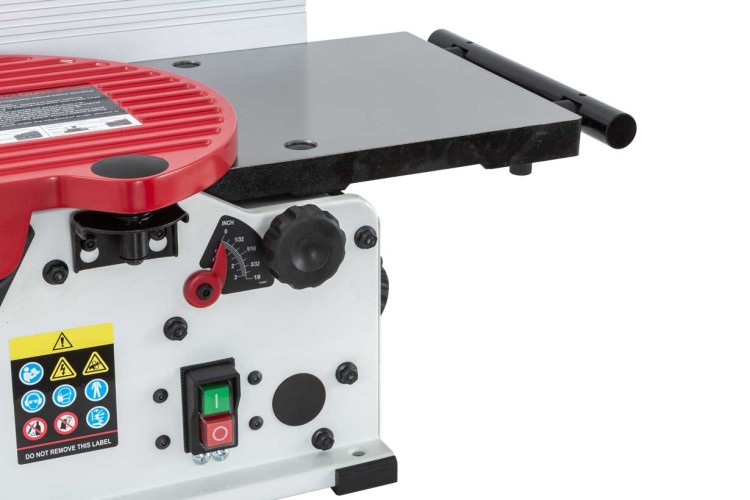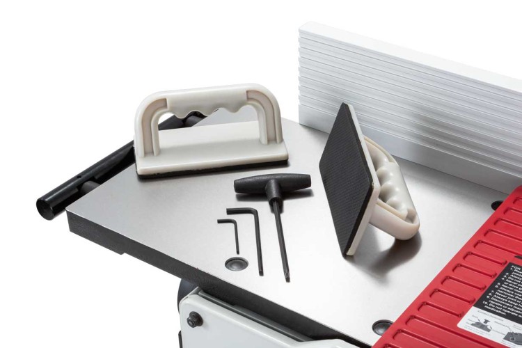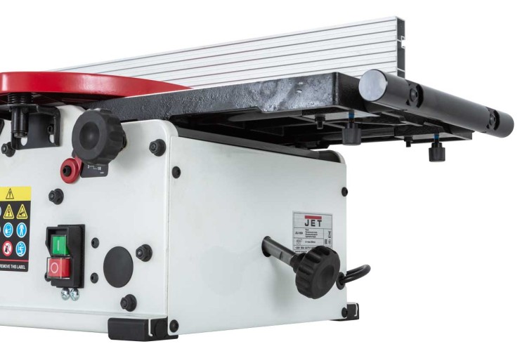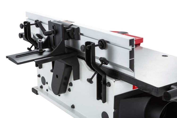 Как и у старших моделей, появилась возможность регулировки подающего и принимающего столов. И не только по высоте, но и по плоскости. А параллельный упор, изготовленный из экструдированного алюминия, имеет небольшой вылет и дополнительно может быть зафиксирован опционально поставляемыми кронштейнами для усиления жёсткости при фуговании тяжёлых длинных заготовок.
