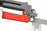Тиски предназначены для фиксации заготовки и могут регулироваться в зависимости от положения угла поворота пильной рамы. Движение широких губок производится маховиком, что позволяет надежно удерживать заготовку во время работы.