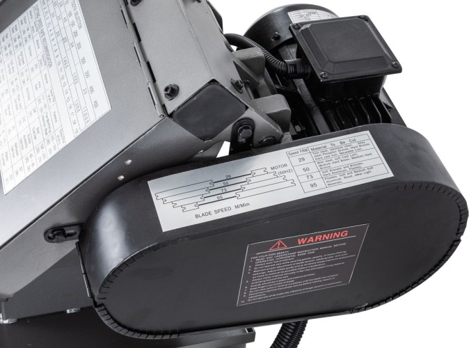 Моторная группа состоит из мощного электродвигателя - 1,5 кВт, обеспечивающего стабильную работу ленточного станка в различных скоростных режимах. Ременная передача позволяет осуществлять пиление заготовок на скоростях движения ленточного полотна в 29, 50, 73 и 95 м/мин. Управление работой станка осуществляется с пульта управления, установленного на консоли. Оборудование оснащено кнопкой аварийной остановки.