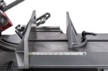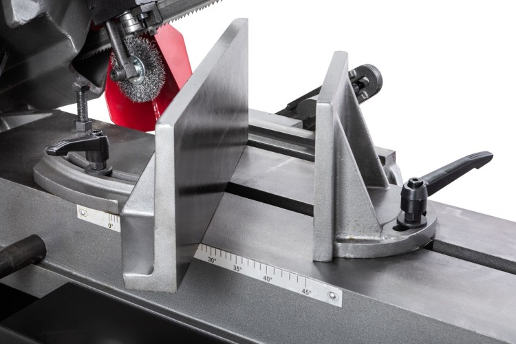 Процесс установки заготовок под нужным углом осуществляется за счет имеющихся механических тисков, оборудованных поворотными губками. Подъем и опускание тяжелой пильной рамы осуществляется за счет функционирования системы гидроразгрузки. С помощью гидроцилиндра можно осуществить регулировку скорости опускания консоли. Необходимое прижимное усилие рамы на обрабатываемую заготовку осуществляется за счет веса консоли.