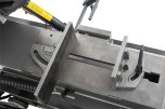 Модель HVBS-712L имеет направляющие, передвигающиеся по консоли. С помощью направляющих можно установить оптимальную величину прохода пилы, повышая качество распила и увеличивая срок эксплуатации ленточного полотна. Направляющие оснащены подшипниками, регулирующими позиционирование ленточной пилы относительно обрабатываемой заготовки, обеспечивая точность распила. На нижней части пильной рамы установлена кордщетка для очистки полотна от стружки. Станок оборудован системой подачи СОЖ непосредственно в зону резания. Натяжение ленточного полотна регулируется вручную.