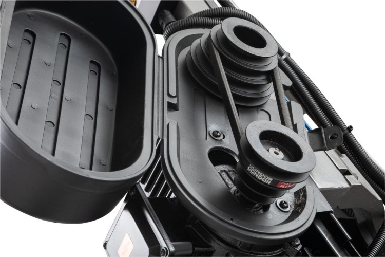 Ременная передача позволяет осуществлять смену скорости движения ленточного полотна. Станок может выполнять распил заготовок в четырех режимах скорости движения полотна 22, 33, 45 и 65 м/мин. Включение двигателя осуществляется через блок управления.