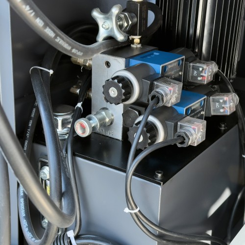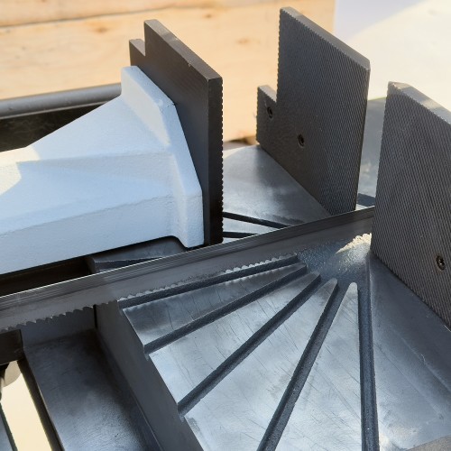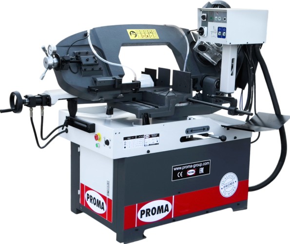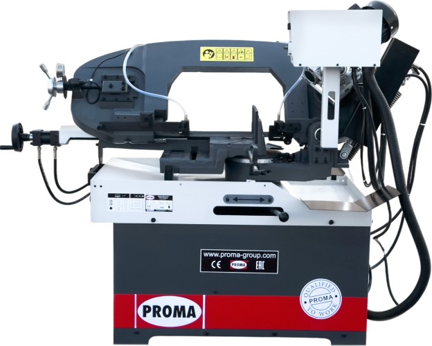 Ленточная пила изготовлена из чугунных составляющих с кожухами, выполненными из металла. Такое решение позволяет обеспечить оптимальную устойчивость и жесткость устройства при распиле деталей, изготовленных из твердых металлов. Пила настраивается для резанья под углом от -45 до 90 градусов. Станок оснащен трехфазным двигателем. Скорость опускания пильной рамы регулируется гидроцилиндром. Модель оборудована системой охлаждения СОЖ, которая позволяет деталям служить максимально долго.