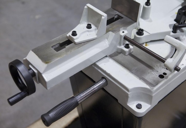 Зажим заготовки осуществляется тисками вручную, подача заготовки - также вручную. Поскольку станок Stalex BS-128HDR открывает линейку станков с гидроразгрузкой – он схож параметрами резки с ручными станками, это пиление не крупных заготовок (профили, уголки, трубы) – станки таких размеров, для обработки заготовок профилей малого сечения не комплектуются системой подачи СОЖ.