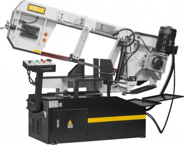 Станок ленточнопильный STALEX BS-2114Т оборудован дросселируемым гидравлическим цилиндром, обеспечивающим скорость опускания пильной рамы в зависимости от профиля заготовки, с оптимальными режимами распила, подъём рамы осуществляется оператором вручную. В рабочей зоне резания полотно точно ведется двумя направляющими головками с твёрдосплавными пластинами. Станок имеет неподвижные тиски и поворотный механизм рамы, для пиления под углом необходимо изменить положение рамы относительно неподвижных тисков.
