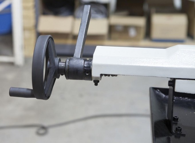 Режущий инструмент – бесконечная сварная ленточная пила. Полотно натягивается с помощью натяжного шкива. Натяжной шкив приводится в движение приводным шкивом, который в свою очередь, приводится через редуктор.