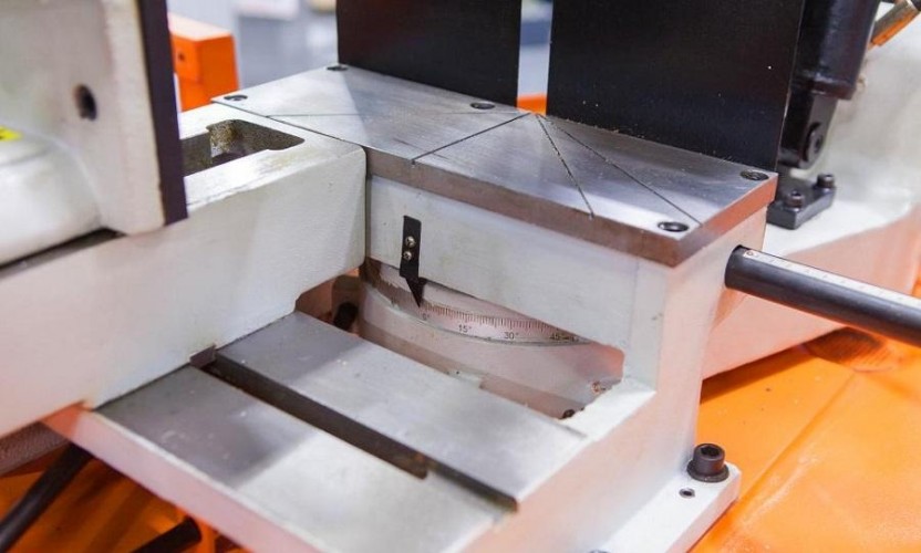 В рабочей зоне резания полотно точно ведется двумя направляющими головками. Станок с возможностью поворота корпуса пилы от -45° 0° до +60°, предназначен для пиления заготовок, под различными углами и при частой смене угла пила (т.е. поворота рамы пилы по градусной линейке относительно неподвижных тисков).
