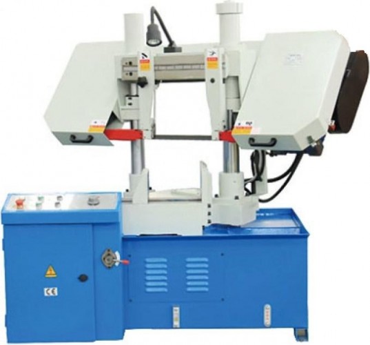Полуавтоматический ленточнопильный станок, предназначен для пиления труб и сплошных заготовок, максимальным диаметром круга 280 мм и прямоугольной заготовки 280x280 мм под углом от 0° (90°) до 45°. Двухстоечные ленточнопильные станки имеют 2 вертикальные стойки (колонны) большого диаметра по которым вверх-вниз перемещается горизонтальная пильная рама. Пильная рама, представляет собой стальную сварную конструкцию. На полуавтоматических станках возможна работа как в ручном режиме, когда каждая операция выполняется вручную посредством нажатия соответствующей кнопки, так и в автоматическом режиме, когда станок выполняет весь цикл резания (зажим заготовки – запуск пилы – опускание рамы – остановка пилы – подъем рамы – отжим тисков). В последнем случае оператор должен лишь обеспечить подачу заготовок и нажатие кнопки «Пуск».