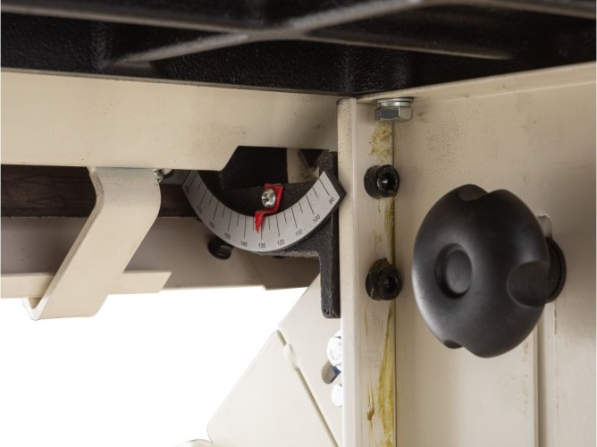 Шлифовальный узел станка выполнен поворотным вокруг продольной оси, его можно установить вертикально, горизонтально или под любым промежуточным углом, фиксация выбранного положения производится эксцентриковой рукояткой без использования инструмента. Основной рабочий стол, сделанный из литого чугуна, регулируется по высоте, что позволяет выровнять его поверхность с плоскостью ленты при её горизонтальном положении или использовать ресурс всей её ширины при эксплуатации в вертикальном. Для фиксации заготовки предусмотрены длинный «параллельный» упор с фиксацией в Т-образном пазу и подвижный угловой.