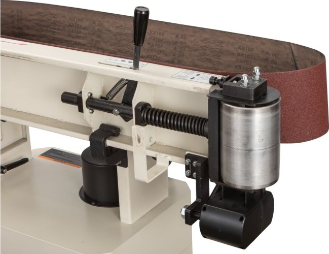 Модель оснащена вспомогательным механизмом, который за счет поворота узла переднего натяжного ролика обеспечивает колебания ленты в направлении перпендикулярном основному движению. Осцилляция способствует более эффективной работе абразива и повышает производительность станка.
