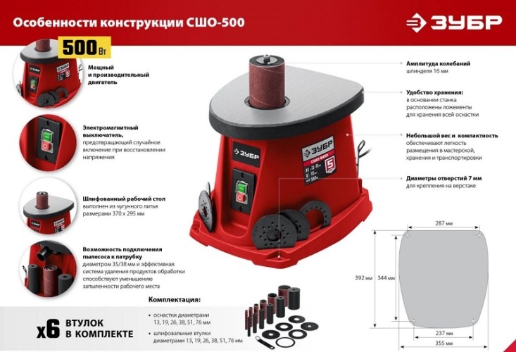 Станок шлифовальный ЗУБР СШО-500 осцилляционный шпиндельный, предназначен для обработки шлифованием криволинейных и прямолинейных поверхностей, кромок и фасок деревянных заготовок путем вращательно-колебательных движений шпинделя. Набор барабанов и абразивных шлифовальных втулок входящих в комплект, позволяет подобрать оптимальную оснастку для обработки. Мощный коллекторный двигатель обеспечивает высокую частоту вращения шпинделя. Станок оптимален для работы с кромками, торцами и краями заготовок с вогнутым профилем. Высокая эффективность при использовании оснастки с такой рабочей поверхностью достигается за счет осцилляции – вертикального перемещения вала. Это увеличивает линейную скорость абразива и предотвращает возникновение продольных царапин из-за дефектов оснастки. Небольшие габариты и вес обеспечивают легкость размещения станка, а также рациональное хранение и транспортировку. В основании станка расположены ложементы для хранения всей оснастки.