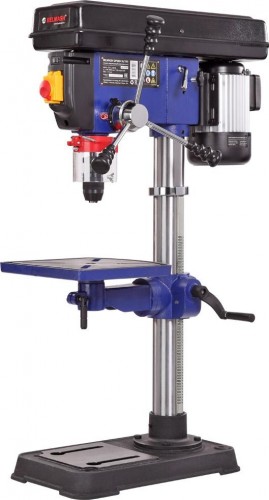 Заготовку можно крепить как к рабочему столу, так и к основанию, все зависит от ее размера. для точного позиционирования точки сверления, станок оснащен лазером - указателем. В комплекте предусмотрены тиски. Для их крепления есть четыре паза на рабочем столе и два на основании. Шкала, расположенная на рукоятке регулировки глубины сверления, показывает ход пиноли шпинделя, с ее помощью можно настраивать ход пиноли, для этого необходимо провернуть шкалу, стрелка на корпусе будет показывать значение, на которое будет возможно погружение сверла, затем затянуть барашек. Наконечники тройной рукояти удобной формы, что способствует плавной подаче сверла к заготовке.