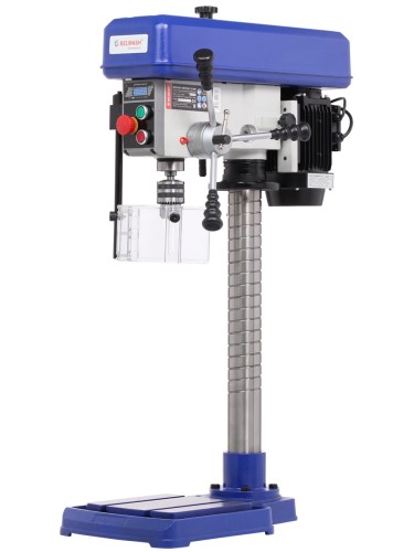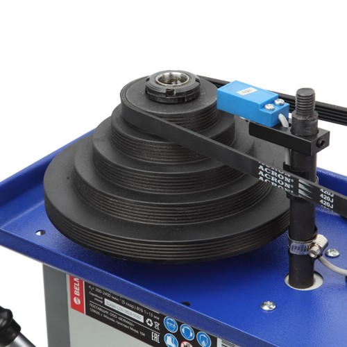 Станок способен сверлить отверстия с максимальным диаметром до 13 мм (в металле) и до 50 мм (в древесине). Патрон ключевой трехкулачковый, с возможностью установки инструмента с хвостовиком до 16 мм. Вращающий момент с вала двигателя на шпиндель передается с помощью клиноременной передачи. Скоростей у данной модели пять: 200, 580, 960, 1550 и 2400 об./мин. Изменить частоту вращения можно переброской ремня на нужную ступень шкивов.