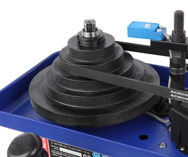 Станок способен сверлить отверстия с максимальным диаметром до 20 мм (в металле) и до 50 мм (в древесине). Патрон ключевой трехкулачковый, с возможностью установки инструмента с хвостовиком до 16 мм. Вращающий момент с вала двигателя на шпиндель передается с помощью клиноременной передачи. Скоростей у данной модели пять: 200, 580, 960, 1550 и 2400 об./мин. Изменить частоту вращения можно переброской ремня на нужную ступень шкивов.