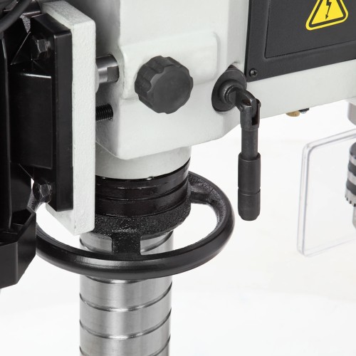 Элементы управления станком выведены на переднюю часть сверлильной головки. Это кнопки включения и выключения, кнопка аварийной остановки. Для точного позиционирования в конструкции этой модели предусмотрены лазерный указатель и подсветка.