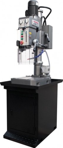 Редукторный сверлильный, настольный станок JET GHD-25 самый маленький станок в линейке JET. На станке установлен двигатель мощностью 0,75 кВт, вращение на шпиндель передается через коробку скоростей, что исключает прокрутку, остановку и застревания режущего инструмента в заготовке. Весь момент передается на шпиндель. Максимальный диаметр сверления в стали составляет 25 мм, а в чугуне максимальное отверстие составляет 30 мм. Станок способен нарезать резьбы до М18. Станок подключается к сети 380В и имеет 2 направления вращения шпинделя, направление вращения переключается на лицевой панели станка, так же на лицевой панели расположена коробка переключения скоростей, всего их 6 от 125 до 2825 об/мин. На станке предусмотрена возможность регулировки глубины сверления, что позволяет выполнять работы в серийном режиме.