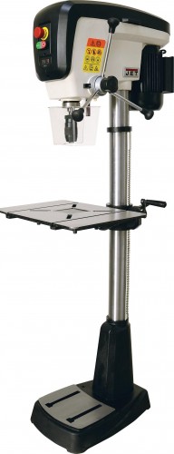 Jet JDP-17 — сверлильный станок, основная особенность которого в том, что он спроектирован специально для ДЕРЕВООБРАБОТКИ. Его конструкция не исключает сверления металла, но имеет усовершенствования, важные в столярном и плотницком деле, что делает станок по-настоящему универсальным. Прежде всего, отличается от обычной сверлильная часть. Так, ход пиноли шпинделя увеличен до 127 мм, это более чем в полтора раза больше, чем у аналогичных станков слесарного назначения. Диапазон передаточных чисел редуктора расширен в область верхних значений, благодаря чему максимальная частота вращения достигает 2900 об/мин, что важно и для сверления, и для шлифования специальными насадками. Смена диапазонов производится переустановкой поликлиновых ремней, причем один из них можно ослабить или натянуть без использования инструментов за считанные секунды. Натяжной ролик фиксируется пластиковым барашком, отвернуть его можно не запачкав рук, что при работе с деревом немаловажно. Подача пиноли на весь ход производится за один оборот рукоятки. На ее оси имеется лимб для отсчета глубины сверления и регулируемый стопор-ограничитель. Рабочий стол выполнен из чугунного литья, что привычно, но его форма и размеры адаптированы не для установки станочных тисков, а непосредственно для фиксации заготовок, что предпочтительнее с учетом того, что деревянные детали, как правило, гораздо крупнее металлических. Поворот вокруг горизонтальной оси возможен на любой угол, что позволяет сверлить в торцевой части. Стол имеет квадратное отверстие в центре, закрытое вкладышем из ДСП. Основание также может играть роль рабочего стола, его поверхность фрезерована и имеет пазы для крепежных приспособлений.