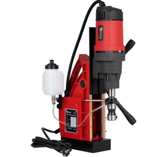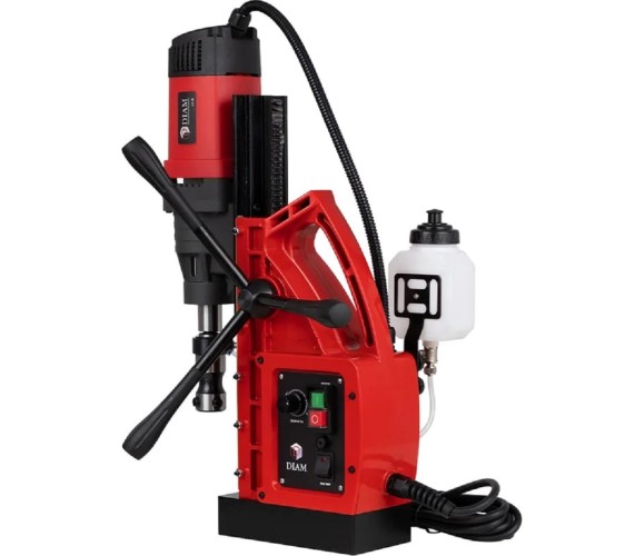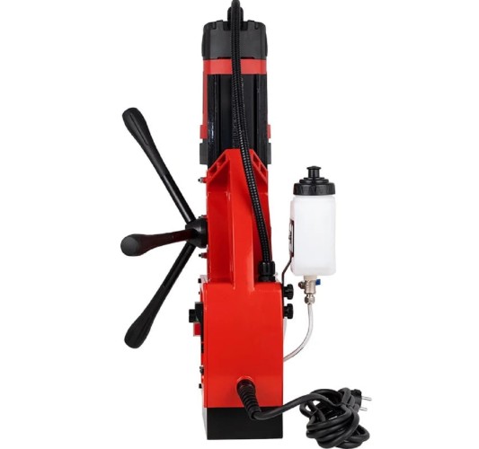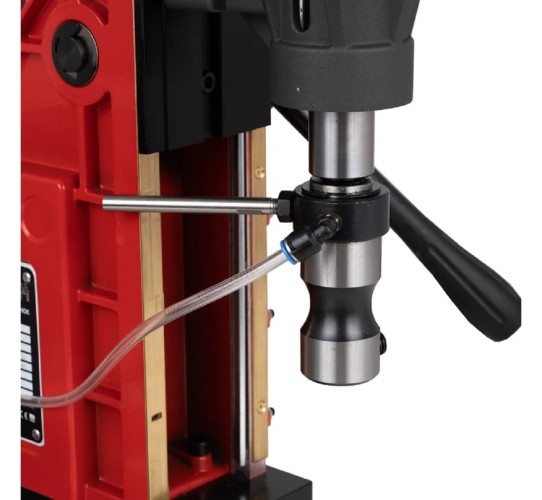 Магнитный сверлильный станок представляет собой электродвигатель с заданной мощностью и числом оборотов. На корпусе имеется ручка плавной регулировки переключения скорости вращения. Шпиндельный узел имеет держатель для сверл WELDON 19/МК2. Транспортировочная ручка, расположенная на стойке обеспечивает легкое перемещение сверлильной машины. Станки снабжены предохранителями. Встроенная система охлаждения при работе подает СОЖ в автоматическом режиме при использовании штифта-выталкивателя (арт.320324). Большой рабочий ход станка позволит с легкостью менять корончатые сверла и упростит центрирование отверстия.
