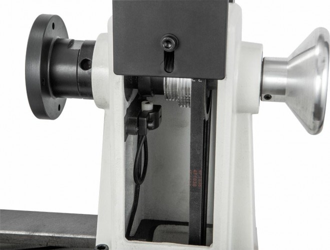 Станок комплектуется синхронным (щеточным) двигателем с электронным блоком плавной бесступенчатой регулировки частоты вращения шпинделя и цифровой индикацией. Кроме этого, предусмотрено три пары шкивов и, соответственно, диапазонов частоты вращения. Приводной ремень поликлиновй, механизм его натяжения на шкивах рычажный, без быстрой фиксации.